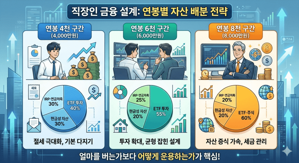 4천만원: 비상자금 확보 + 16.5% 세액공제 시작 (기반 만들기) 6천만원: 연금 납입 확대 + ETF 비중 증가 (균형 잡기) 8천만원: 한도 최대 활용 + 투자 자산 집중 확대 (자산 불리기)